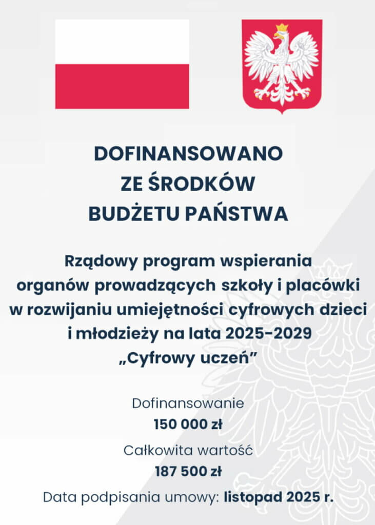 Z radością informujemy, że Powiatowe Centrum Wspierania Edukacji w Olecku otrzymało dofinansowanie z rządowego programu „Cyfrowy Uczeń”. Program wspiera rozwój kompetencji cyfrowych dzieci i młodzieży oraz doposaża szkoły i placówki w nowoczesne technologie edukacyjne. Dzięki środkom nasz Poradnia zyskała lepsze zaplecze dydaktyczne i nowe narzędzia wspierające naukę i terapię.